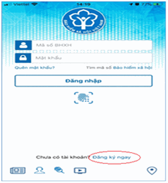 Bước 1: Nhập tài khoản (mã số BHXH) và mật khẩu (đã gửi trước đó đến số điện thoại đăng ký) vào các ô tương ứng để đăng nhập ứng dụng