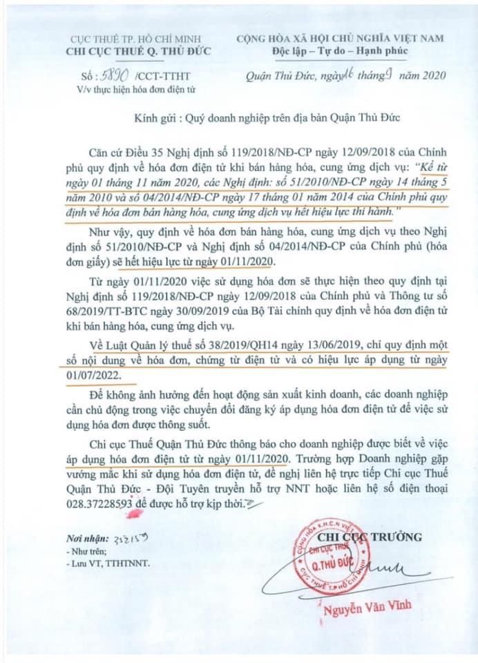 Chi cục Thuế Quận Thủ Đức Thông báo cho các doanh nghiệp được biết về việc áp dụng hóa đơn điện tử từ ngày 01/11/2020