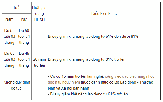 - Đủ 15 năm làm nghề, công việc nặng nhọc, độc hại, nguy hiểm hoặc đặc biệt nặng nhọc, độc hại, nguy hiểm hoặc làm việc ở nơi có phụ cấp khu vực hệ số 0,7 trở lên. Lao động nam từ đủ 55 tuổi 03 tháng, nữ từ đủ 50 tuổi 04 tháng.