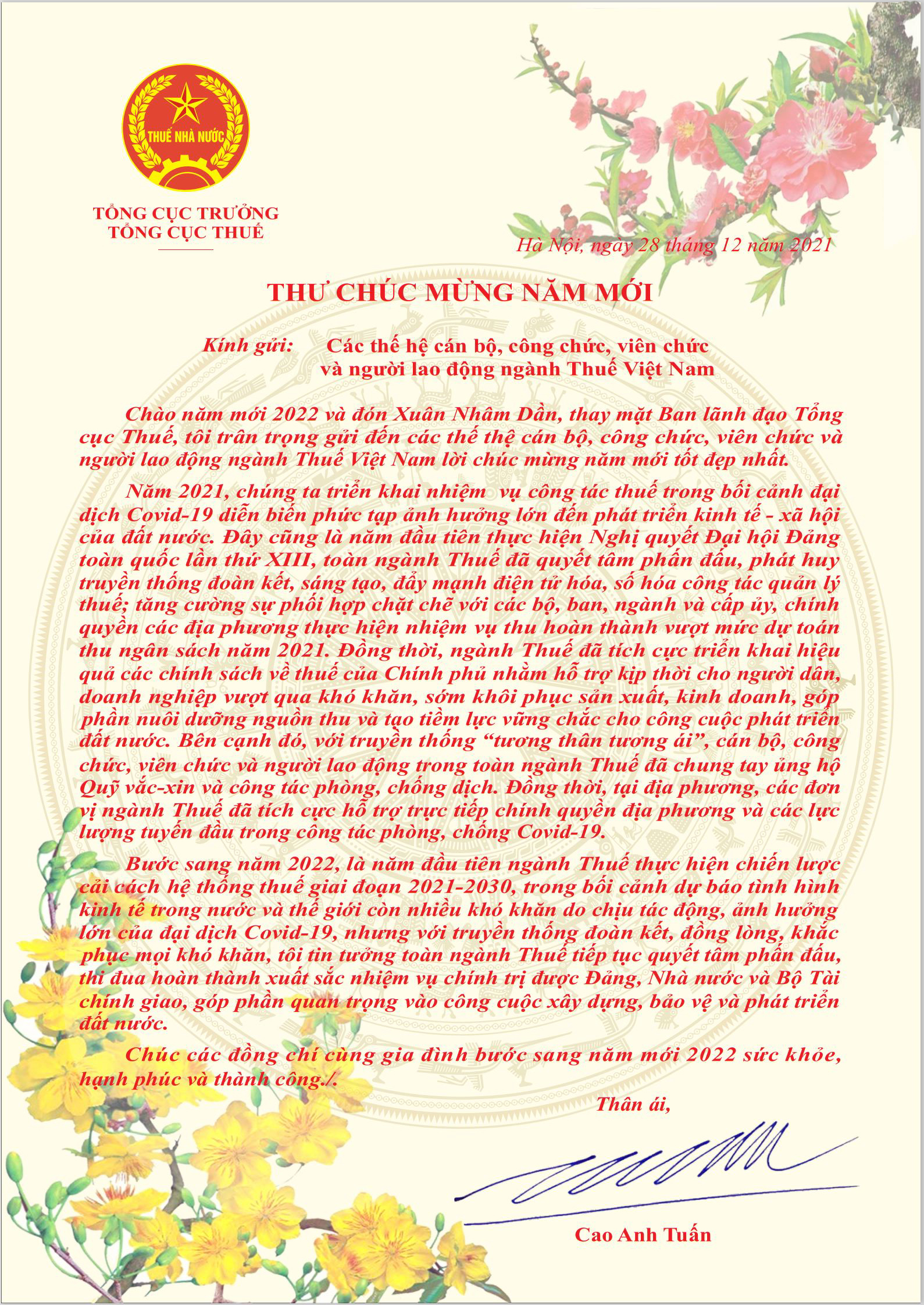 Tổng cục trưởng Tổng cục Thuế Cao Anh Tuấn gửi Thư chúc mừng năm mới 2022