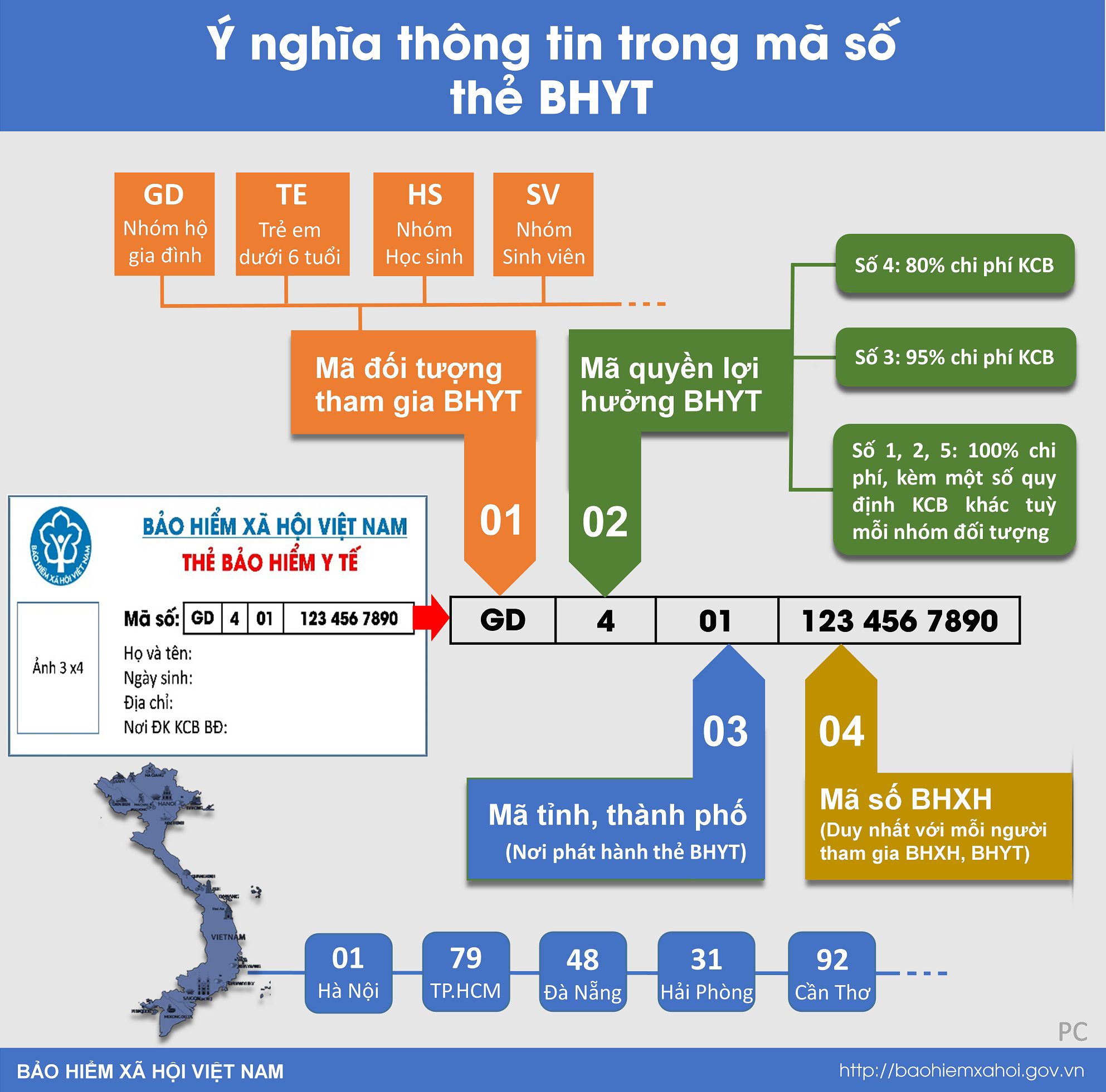Từ năm 2017, BHXH Việt Nam thay đổi cấu trúc trong mã số trên thẻ BHYT theo hướng đồng bộ với số sổ BHXH. Trong mã số thể hiện: Nhóm đối tượng, địa chỉ và quyền lợi khám chữa bệnh (KCB) của từng người tham gia.