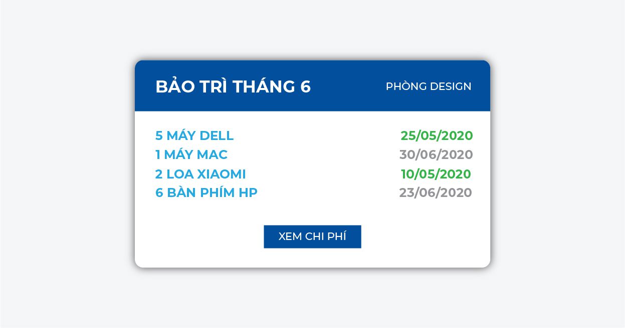 Khởi tạo, quản lý thiết bị/tài sản. Khởi tạo yêu cầu bảo trì, quản lý trạng thái bảo trì thiết bị. Ghi nhận sổ sách kế toán các chi phí liên quan bảo trì